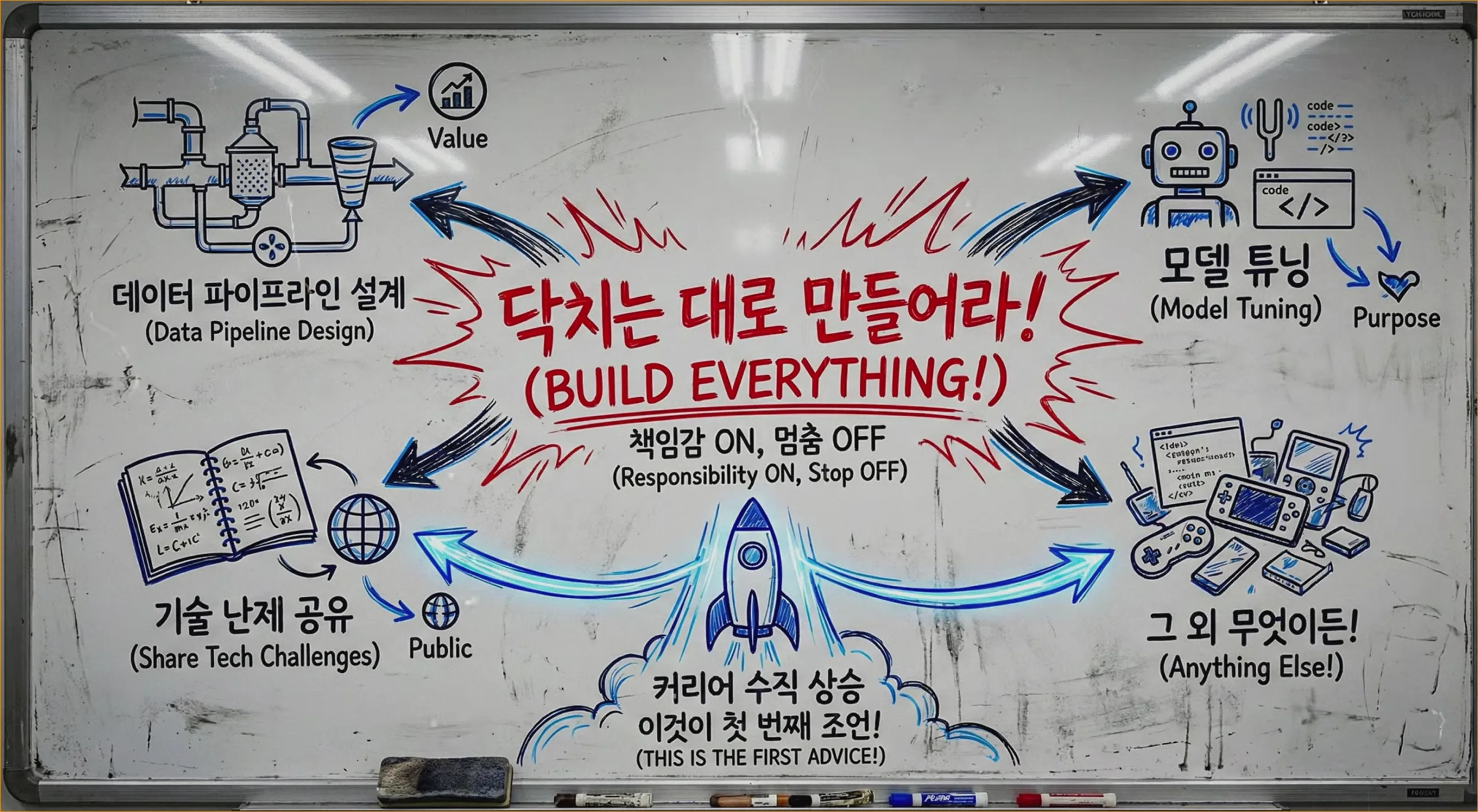 이 강연(및 요약 자료)에서 반복적으로 드러나는 원칙은, “AI 기술을 어떻게 공부할까” 이전에 “어떻게 일하고, 무엇을 쌓을까”에 가깝습니다.